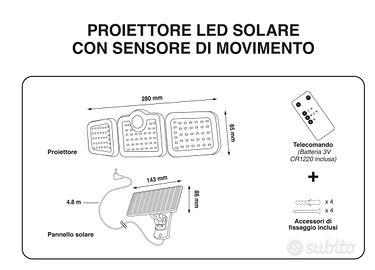 Proiettore Led Solare con sensore di movimento e telecomando 108 LED - 10 W - Max 600 lumen - Luce Calda - Batteria Integrata Autonomia 6/10 ore Misure come da foto in annuncio.
