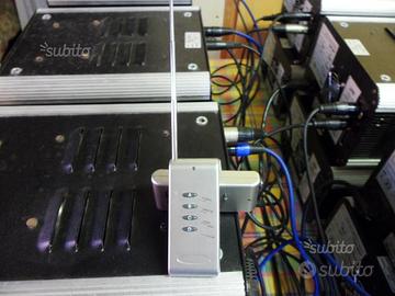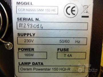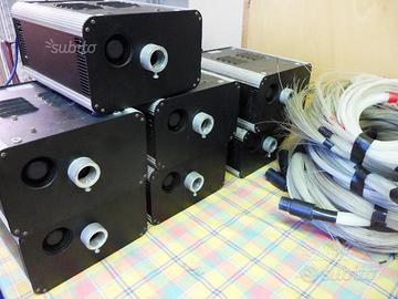 vendo 8 fari per illuminazione a fibra ottica usati ma perfettamente funzionanti, marca fort modello ccr n 2000 dmx 150 he alimentazione 220v 165w completo di lampada osram hqi r 150w e fascio fibra ottica, collegabili con cavo seriale, 1 master 7 slave e controller da pc non forniti. in aggiunta n5 telecomandi. preferibile consegna a mano o spedizione a carico acquirente. vendita in blocco.
