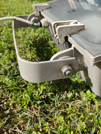 Corpo robusto, in alluminio, vetro di sicurezza temperato spesso 5 mm. Dotato di guarnizioni , impermeabile alle intemperie !! Staffa in acciaio per essere fissato ovunque con la regolazione a scelta!