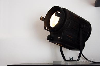 La forma è interessante a prescindere dal fatto che la lampada sia accesa o spenta: un faro teatrale/cinematografico usato e ricondizionato, ora allestito con portalampada Edison E27 e lampadina led 4,5W, cavo di mt 3, interruttore passante, spina civile italiana da 10 A.