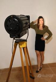 Faro pinspot cinematografico della coemar risalente agli anni 70 del 900. Il faro è stato completamente restaurato, smontato totalmente, sabbiato e riverniciato, è stato ricablato ed è perfettamente funzionante. Tutte le parti che lo compongono sono originali. e' stato montato su cavalletto da geometra in legno coevo delle officine galileo per creare una lampada da terra moderna ed elegante capace di arredare ogni ambiente e di farsi notare ovunque venga posizionata. Il fascio di luce del faro è regolabile tramite una vita senza fondo che girando avvicina o allontana la lampada dalla lente creando un fascio di luce ampio o stretto come si vede dalle foto. Nella parte frontale, è presente un porta filtri nel quale si possono inserire i filtri colorati per modificare il colore della luce. il faro pù essere facilmente smontabile dal cavalletto e volendo può anche essere appeso a soffitto o su altri supporti. Misure: Altezza minima cavalletto 91 cm Altezza minima cavalletto con faro 121 cm Altezza massima cavalletto 150 cm Altezza massima cavalletto con faro 180 cm Faro: Altezza 30 cm Larghezza 35 cm Profondità 20 cm Diametro lente 16 cm