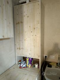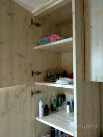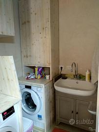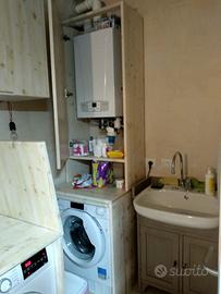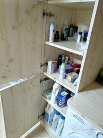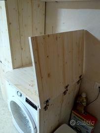 Base copri lavatrice e copri caldaia in abete massello senza schienale con relativa coperta e catene di fissaggio per stabilità spazzolato con misura base da lungh.61 prof. 65 h 85 vano a giorno parte centrale e superiore prof. 35 h 110 con cerniere regolabili e anta con apertura a gola. colonna laterale grande con misura lungh.50 prof. 48 h 227 con 3 ante completo di ripiani aggiustabili interni e 3 ante con cerniere per apertura sempre con gola. top fisso con fianco per copri asciugatrice e piano ribaltabile con relative cerniere per passaggio, pensile con misura lungh.90 prof. 35 h 70 con ripiano aggiustabile e 2 ante con gola per apertura e attaccaglie, ante tutte costruite in abete a 3 strati in modo che non creino problemi nel tempo e finitura sbiancata su tutto il mobile, completo di spazzolatura cerniere gambette livellatrici supporti per ripiano e giunzioni del tutto. Competenza serietà ed esperienza nel settore del mobile ci contraddistinguono dal resto dei venditori. il prezzo si intende completo di finitura sbiancata (come da foto) franco fabbrica con imballo non comprendente di iva. costruita su commissione e venduta, non teniamo magazzino ma essendo i diretti produttori possiamo fornirla su specifiche ed esigenze che si richiede. Per qualsiasi altra informazione non esitate a contattarci grazie DIRETTAMENTE DAL falegname. ASTENERSI RIVENDITORI E COMMERCIANTI