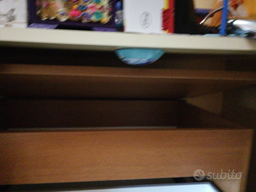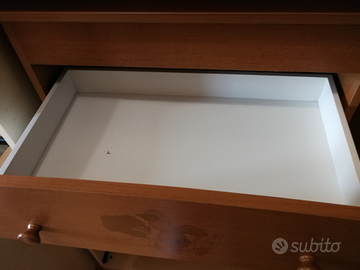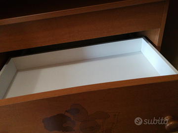Fasciatoio con cassetti, color ciliegio con ruote per poterlo spostare e apertura della base per inserire la vaschetta per il bagnetto(non presente).