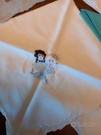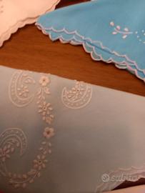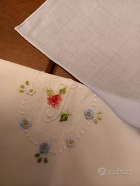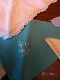 N°14 fazzoletti vari colori ricamati a mano, alcuni con le lettere P, I oppure Paola e n°4 fazzoletti con riporti in trina che possono essere utilizzati da centrini