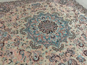 Nei toni del beige, rosa e turchese con filo dorato; essendo seta il colore vira a seconda della luce.