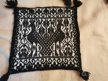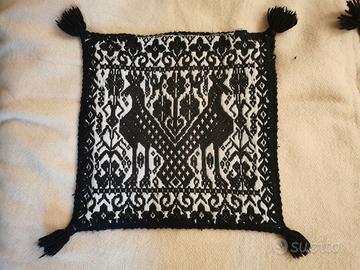 Pregiati portacuscini fatti a mano. Artigianato artistico sardo ,raffigurante le tipiche pavoncelle. Il materiale è lana . I' abbinamento bianco e nero e le linee stilizzate fa si che possano integrarsi bene sia in un ambiente moderno che classico. manca qualche pon pon e presentano normale segni del tempo,ma in generale le condizioni sono molto buone e sono molto d' effetto.