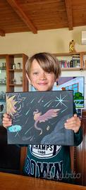 Opera su tela 20x30 cm, realizzata a mano da mio figlio di 9 anni, giovane artista appassionato di creature leggendarie e mondi fantastici.