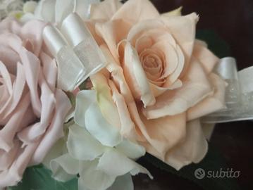 Ferma tenda con rose color tortora e rosa antico con ortensie bianche fiocco centrale con rosellina in raso fatta a mano Creazioni handman