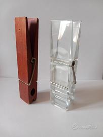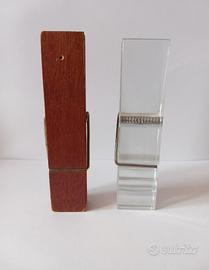 Fermacarte a forma di molletta, una in legno e una in plastica trasparente.