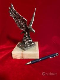 Vendo un bel fermacarte da scrivania con un'aquila in resina montata su una bella base di onice. La base misura cm.10x10 altezza cm.3 , con l'aquila l'altezza totale è di cm. 20 circa.