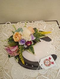 Creazioni artigianali porte-bonheur realizzate con veri ferri di cavallo e fiori artificiali.