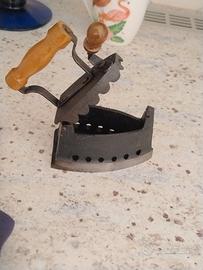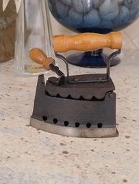 Articolo anche decorativo e da collezione antico ferro da stiro a carbone in ghisa con manico in legno , risale ai primi '900 , era un ferro da precisione per questo è di domensioni ridotte. È in perfetto stato di conservazione come potete vedere. Misure : altezza manico compreso 11 cm , larghezza 11 cm circa. Si deve spostare il pomello di legno ovviamente per fare spostare la piccola astina di ghisa in modo che il ferro da stiro si apra