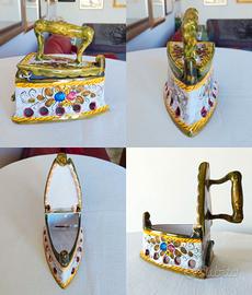 Ferro da stiro ornamentale in pregiata ceramica di Deruta, decorato a mano con motivi floreali policromi