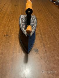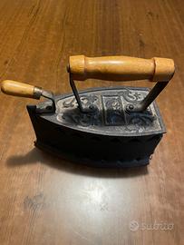 L'oggetto mostrato è un antico ferro da stiro a carbone (o a carbonella), realizzato in ghisa con manico in legno. Questo tipo di ferro veniva utilizzato per stirare i tessuti riscaldando la base metallica con braci ardenti inserite in un apposito compartimento interno.