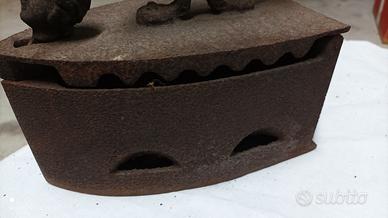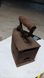 Ferro da stiro a carbonella del secolo scorso. Misure: base: cm 21 x 11 altezza corpo: cm 11 - cm 15 al dispositivo apertura altezza con manico: cm 21. Ritiro a San Pietro in Cariano
