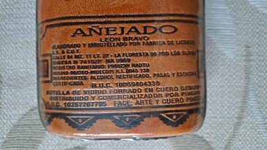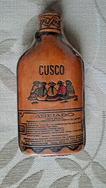 Fiaschetta in cuoio decorata nella parte anteriore con un Tumi peruviano e nella parte posteriore con la scritta Cusco immagini tipiche peruviane e informazioni sul produttore. Contiene 250 ml di pisco Confezione originale sigillata