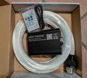Fibra Ottica da 500 punti luce da 0,75 mm di diametro e lunghezza 5 metri, ovviamente può essere tagliata con la misura che si preferisce, comprensivo di illuminatore e telecomando per cambiare colore ed altro a distanza. RGBW e WiFi con 3 anni di garanzia con ricevuta di acquisto disponibile.