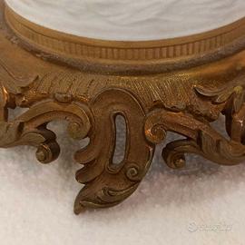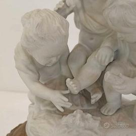 Figurina in bisquit su base in ottone raffigurante scenetta di angeli giocosi.