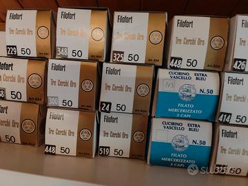 Vendo questi rocchetti da 1000 MT di filo Tre Cerchi Oro ad uso professionale di colori marrone, nero, grigio. le confezioni sono da 10 o 12 rocchetti. Posso confezionare scatole con diverse tonalità di colore. Il prezzo di 15 euro è per una scatola. Chi acquista 8 scatole faccio 100 Euro