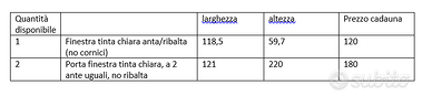 Vendo finestra con anta/ribalta e porte finestre in larice, tutto con vetro camera e doppia guarnizione. Eventualmente disponibili i cassonetti per le persiane. Perfettamente funzionanti e in ottimo stato. Misure e prezzi come da foto.