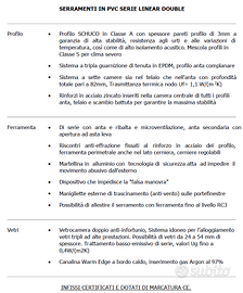 - Profilo SCHÜCO Linear Double Classe A, spessore pareti 3 mm per la massima stabilità e durata nel tempo. PVC con mescola in Classe S per resistere a climi severi.