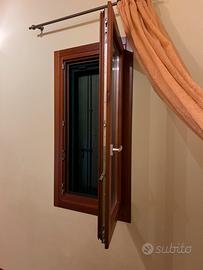 Telai in legno di abete o pino lamellare, spess. 68, completi di ferramenta, chiusura anta ribalta, 2 guarnizioni, maniglia, vetro camera 24 mm, completi di cornici di rifinitura interne, verniciati tinta noce.
