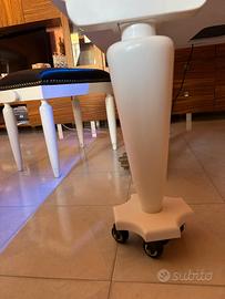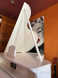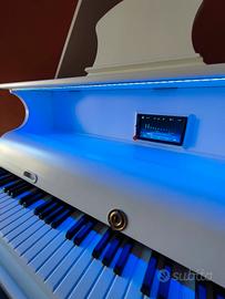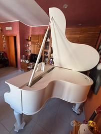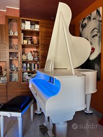 Finto pianoforte mezza coda laccato bianco, con led colorati che cambiano in base alla musica incorporata grazie allo stereo interno. Un complemento che oltre ad essere visibilmente un pianoforte funge anche da contenitore interno pensato per essere una bellissima fioriera