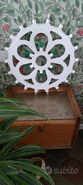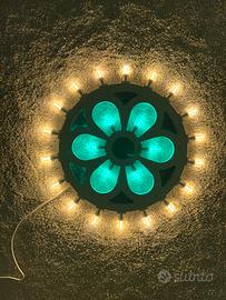 Luminaria a forma di fiore con luci bianche calde all’esterno e verdi all’interno.