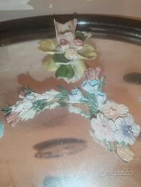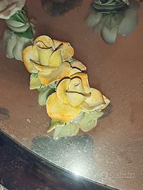 10 gruppi di fiori , roselline e portacandele di Capodimonte vintage su vassoio ovale a specchio con bordo in legno