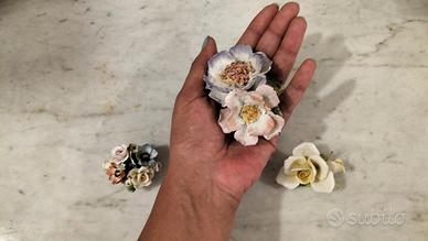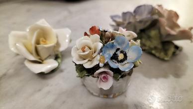 Porcellana di Capodimonte, artigianato italiano, cestino di fiori ricco di dettagli dipinto a mano. Piccola scultura con fiori Capodimonte con " N" coronata. Set 3 piccole sculture ricche di dettagli.