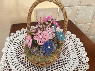 Cestino con composizione floreale di perline di vetro, realizzata a mano.