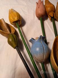 Vendo 10 fiori in legno artigianali, sono di varie forme e colori molto pesanti e dipinti a mano lunghi 75 cm bellissimi per qualsiasi arredamento.
