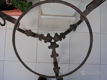 Eccezionale elemento decorativo formato da una base in ferro battuto scolpita e patinata, un cratere in rame sbalzato a mano, traforato e patinato.
