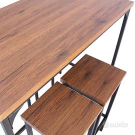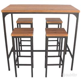 MATERIALE: Piani in pressato rivestiti di pvc colore legno simile Noce spessore 3 cm. Struttura tubolare 2,5x2,5 cm in metallo colore bronzo marrone scuro. Piedini in plastica. Utilizzo Domestico. Sono da interno. Portata tavolo 40 kg. Portata sgabello 100 kg.