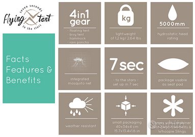 Flying tent - tenda ultraleggera con molteplici utilizzi (amaca con zanzariera, amaca con copertura impermeabile, tenda bivy da 1 posto, poncho, ...). Leggera e costruita con materiali di alta qualità. Le dimensioni da aperta sono 270x110x55 cm. Peso complessivo di 2450 g, con tutte le forniture, pronta all'uso. Articolo come nuovo, utilizzato una volta (vedi foto) e in condizioni perfette.