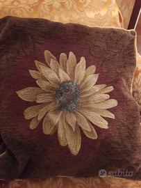 Fodera grande per cuscino con fiore centrale su tessuto e tutto il resto del cuscino è in ciniglia. Il fiore è sia sul davanti che sul dietro. Guarnizione tutto intorno in cordoncino di cotone. Cerniera laterale