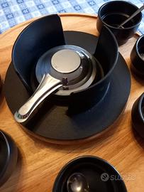 Set per fonduta NUOVO, mai usato, composto da piatto in legno girevole, 6 baccinelle nere ceramica, 6 piatti neri ceramica con scomparti, 6 cucchiaini, 6 forchettone, fornello in ghisa nera, paraschizzi/coperchio ghisa nera, bruciatore acciaio.