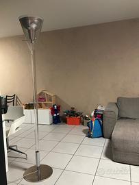 Lampada da terra a luce indiretta dimmerabile, a pavimento con cursore a scorrimento. Stelo in vetro borosilicato trasparente e riflettore in alluminio cromato lucido. Base e supporto riflettore in metallo cromato. Cavo di alimentazione, dimmer e spina trasparenti. Spina di tipo schuko,