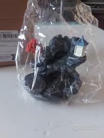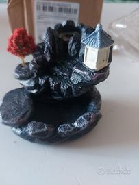 L'oggetto mostrato in foto è realizzato in resina o ceramica smaltata, con un design che riproduce un paesaggio montano in miniatura, completo di alberello e piccola pagoda