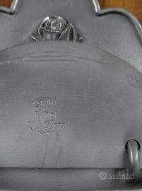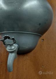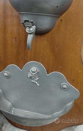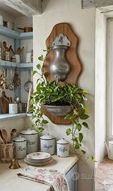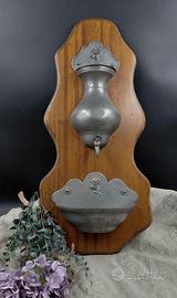 Se stai cercando quel dettaglio capace di trasformare un angolo anonimo della casa in uno scorcio ricco di fascino e nostalgia, questa fontana da parete ornamentale è il pezzo che fa per te. Non è solo un oggetto decorativo, ma un vero e proprio richiamo allo stile rustico e signorile delle antiche dimore di campagna. L'elemento centrale è una splendida ampolla in peltro dalla linea classica e panciuta, montata su una solida base in legno massiccio, sagomata con curve armoniose che seguono il profilo degli elementi metallici. Il metallo presenta quella tipica lucentezza sorda e vellutata che solo il peltro sa regalare. Sia il serbatoio superiore che la vaschetta di raccolta sono impreziositi da raffinati fregi a rilievo raffiguranti delle rose in boccio, un dettaglio romantico che ammorbidisce la severità del metallo. La spalliera in legno, con le sue venature a vista e una calda tonalità miele, fa da cornice perfetta, creando un contrasto materico affascinante tra la freddezza del metallo e il calore del supporto naturale. Il piccolo rubinetto a leva, posto alla base dell'ampolla, aggiunge un tocco di realismo e completezza alla composizione, rendendola un perfetto esempio di antiquariato decorativo. 📏 Dimensioni: 33x15cm altezza totale 70cm