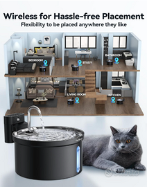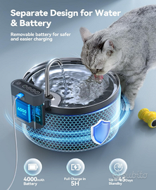 FONTANA PER GATTI SENZA FILI - L'alimentazione a batteria e l'assenza di elettricità la rendono portatile e non vincolata a una presa di corrente. È particolarmente utile se vi piace viaggiare con il vostro gatto. Per abbeverare il gatto. Il dispenser d'acqua è stato appositamente progettato per dare ai gatti un accesso continuo all'acqua fresca e corrente. I gatti hanno un istinto naturale a preferire l'acqua corrente e questa fontanella risponde esattamente alle loro esigenze