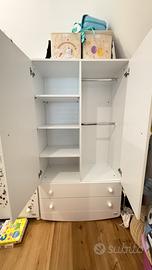 L'armadio a due ante in legno Geppetto di Foppapedretti completa la cameretta del bambino. Capiente e funzionale, ha due ampi cassetti inferiori, ripiani regolabili secondo le esigenze e due barre appendiabiti. Ha piedini in legno di faggio e maniglie incluse. Dimensioni cm: H 180 | P 50 | L 90