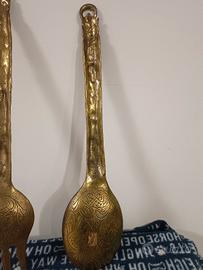 cucchiai decorativi (e una forchetta decorativa) in ottone o bronzo (probabilmente ottone), non pensati per l’uso alimentare, ma come: