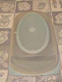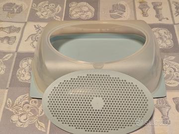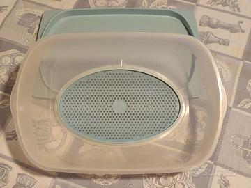 Base di colore azzurro e coperchio trasparente opaco con filtro di aerazione asportabile.