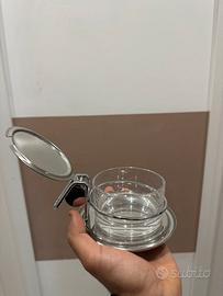 • Componenti: Composta da un piattino argentato, una ciotola in vetro centrale protetta da un cerchio in acciaio e un coperchio coordinato dotato di manico e pratica insenatura per il cucchiaino.