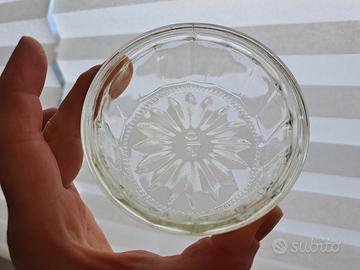 In buone condizioni vintage, vetro intatto, qualche segno sullaparte metallica. Per uso decorativo,uso in cucina, utilizzabile anche come zuccheriera.