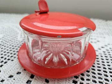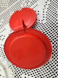 Formaggiera vintage di colore rosso vivace, prodotta negli anni ’70 in Italia dalla STO. Corpo rimovibile in vetro, diametro totale con manico 14 cm. , altezza 6 cm.