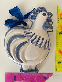 Formella originale Thun, collezione Riccio, in ceramica decorata a mano bianco e blu. Soggetto gallo stilizzato, pezzo vintage molto ricercato dai collezionisti del marchio. Completa di fiocco blu originale. Il retro presenta la firma della linea e l'incavo per appenderla facilmente alla parete. Oggetto integro, senza crepe o sbeccature. Perfetto per arredare la cucina o per amanti del genere country chic.