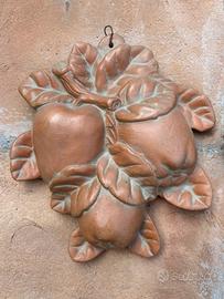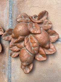 Vendo n. 2 formelle in coccio, effetto anticato, da appendere alle pareti. Rappresentano mele e limoni, con gancio. Misure 20x19 cm e 20x21 cm. Nessun difetto o scheggiatura, ne’ sul davanti, ne’ sul retro. Vendo per inutilizzo.