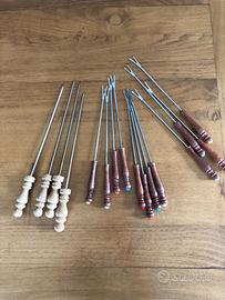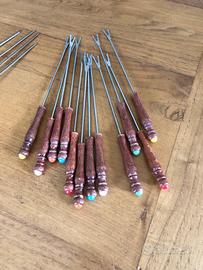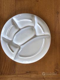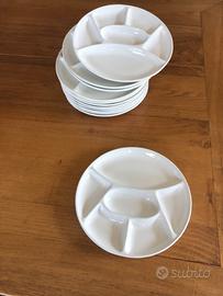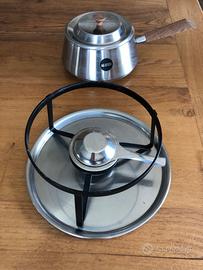 Fornello Alessi in acciaio e legno, nuovo, mai usato, anni '90 (misure: piatto base diametro 26 cm, altezza fornello montato 23 cm) con 12 piatti in ceramica (25 cm di diametro) a 6 scomparti e 12 forchette Alessi con manico in bambù + 4 stuzzicadenti Alessi con manico in legno, vendibili anche separatamente ai seguenti prezzi: Fornello (60 €), Piatti (50€), Posate (50€)